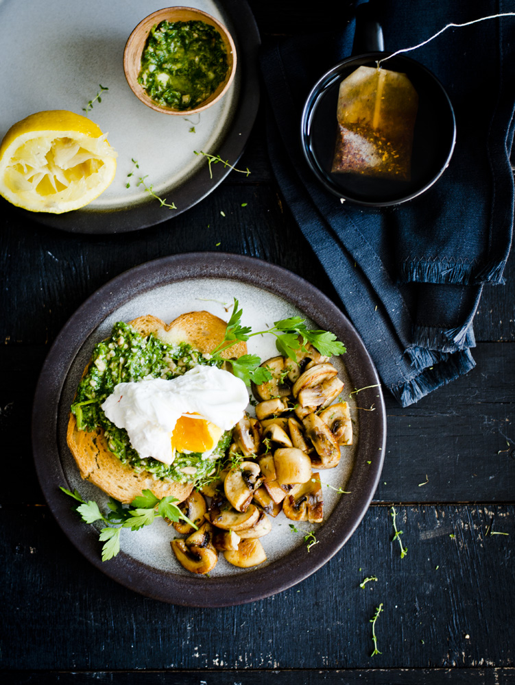 Praca w domu ma swoje plusy i minusy. Jednym z wielkich plusów jest na pewno fakt, że nigdzie rano nie muszę się spieszyć. Mogę w spokoju, powoli zjeść śniadanie i cieszyć się tym co mam na talerzu. Lubię śniadania, które mają wiele smaku, są sycące i dodają energii do działania. Ten opis idealnie wypełnia taka grzanka-świeżość pietruszkowego pesto, delikatne jajko, chrupiąca grzanka i  moje ukochane pieczarki z tymiankiem- pycha!