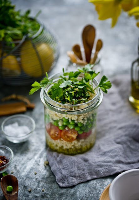 Groszek gotujemy w lekko osolonej wodzie do miękkości, odcedzamy i studzimy. Pomidorki kroimy na połówki. Natkę pietruszki siekamy drobno i mieszamy z sokiem z cytryny i oliwą a na koniec doprawiamy do smaku solą, pieprzem i płatkami chili. W słoiku warstwowo układamy kaszę, pomidory, groszek i kolejną warstwę kaszy. Na koniec dodajemy przygotowany dressing. Przed jedzeniem wszystkie składniki dokładnie mieszamy w słoiku. Gotowe!